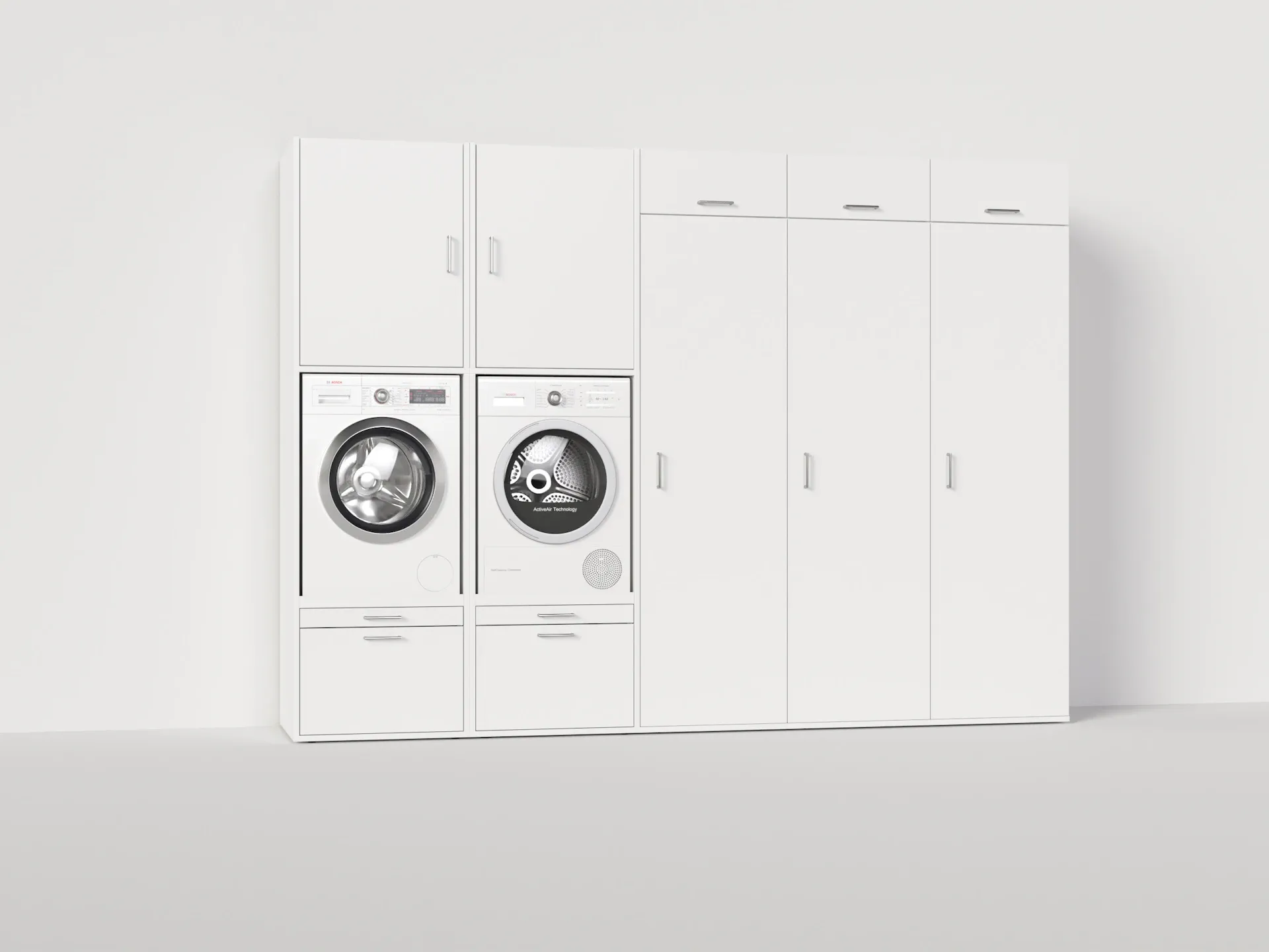 Met de Kastenwanden van Wastoren® in een tijdloos witte look maakt u uw wasplaats, berging, bijkeuken of badkamer niet alleen overzichtelijk en gebruiksvriendelijk, maar ook stijlvol. De kastenwand plaatst uw wasmachine en droogkast naast elkaar op een comfortabele werkhoogte van 60 cm. De uitschuifbare plank kan worden gebruikt voor het plaatsen van uw wasmand. Dit maakt het in- en uitladen van de was veel ergonomischer, waardoor bukken verleden tijd is! Onder de machines vindt u ruime onderlades waarin u de wasmand en andere benodigdheden kunt opbergen. Ook kunt u de hoge opbergkasten, klepkasten of bovenkasten gebruiken voor extra opbergruimte. Het leidingwerk kan netjes worden weggewerkt achter de kasten, wat bijdraagt aan de strakke en opgeruimde uitstraling. De kast is bovendien ook geschikt voor kleinere koelkasten en/of vriezers, wat flexibiliteit biedt in het gebruik van uw ruimte.