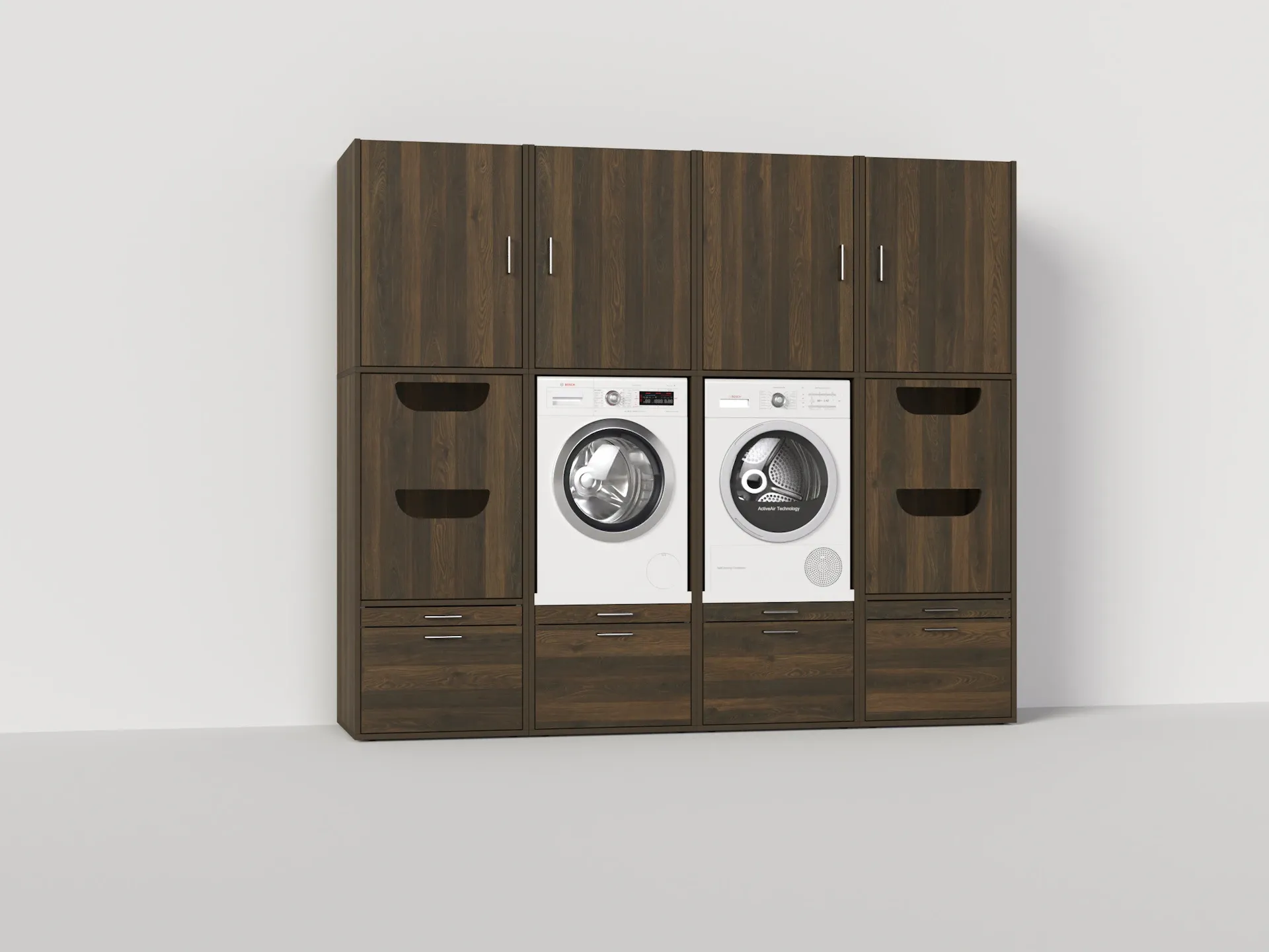 Met de Kastenwanden van Wastoren® in een japandi walnoot houten look maakt u uw wasplaats, berging, bijkeuken of badkamer niet alleen overzichtelijk en gebruiksvriendelijk, maar ook stijlvol. De kastenwand plaatst uw wasmachine en droogkast naast elkaar op een comfortabele werkhoogte van 60 cm. De uitschuifbare plank kan worden gebruikt voor het plaatsen van uw wasmand. Dit maakt het in- en uitladen van de was veel ergonomischer, waardoor bukken verleden tijd is! Naast het speciale inzetstuk voor de wasmand vindt u ook onder de machines ruime onderlades waarin u de wasmand en andere benodigdheden kunt opbergen. Ook kunt u de bovenkasten gebruiken voor extra opbergruimte. Het leidingwerk kan netjes worden weggewerkt achter de kasten, wat bijdraagt aan de strakke en opgeruimde uitstraling. De kast is bovendien ook geschikt voor kleinere koelkasten en/of vriezers, wat flexibiliteit biedt in het gebruik van uw ruimte.