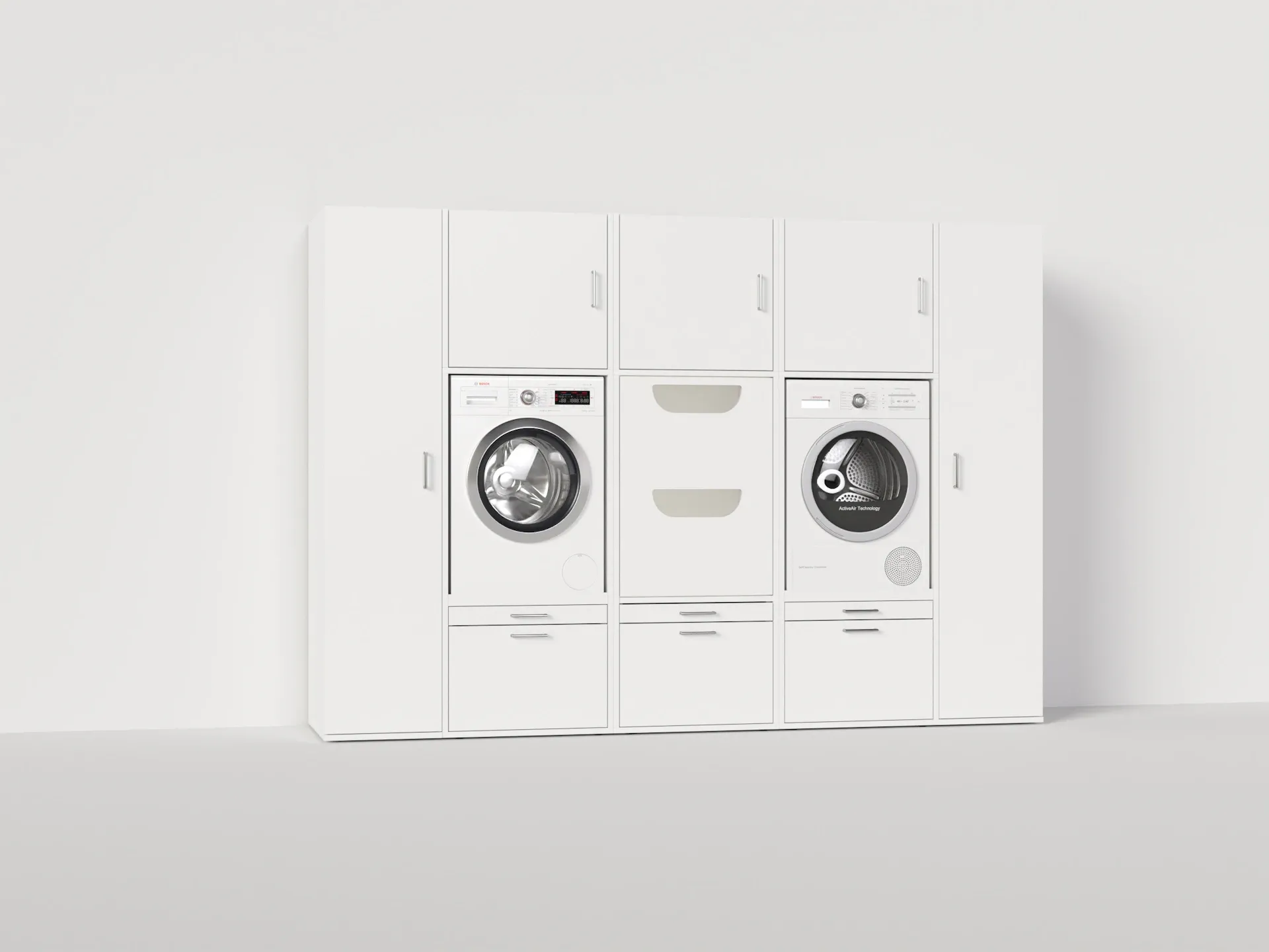 TaalKastenwand voor wasmachine en droogkast in witte look | Dubbele verhoger | Met uitschuifbare plank en lade voor de wasmand | Met bovenkasten van 61 cm hoog, hoge opbergkasten van 45 cm breed en speciale opberkasten voor de wasmand