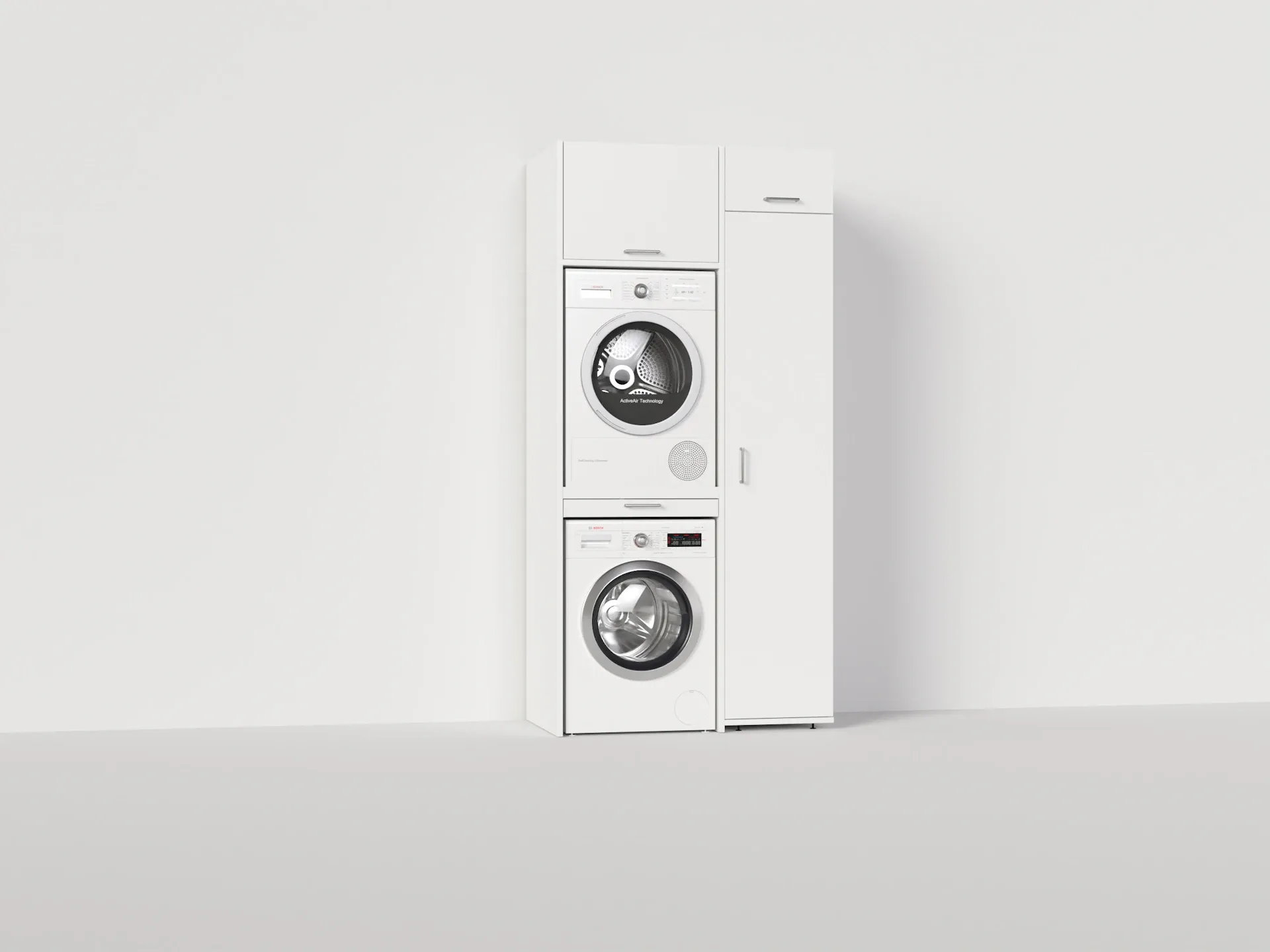 Met de Slimline serie van Wastoren® in een tijdloos witte look maakt u uw wasplaats niet alleen overzichtelijk en gebruiksvriendelijk, maar ook stijlvol. Met deze kast stapelt u 100% veilig uw droogkast en wasmachine boven op elkaar. Het plaatsen van een droogkast op een wasmachine is ideaal voor kleinere wasplaatsen waarbij u efficiënt moet omgaan met de beschikbare meters. De uitschuifbare plank/lade kan worden gebruikt voor het plaatsen van uw wasmand. Dit maakt het in- en uitladen van de was veel ergonomischer en makkelijker. De klepkast en hoge opbergkast kunnen worden gebruikt voor extra opbergruimte voor al uw wasbenodigdheden. Het leidingwerk kan netjes worden weggewerkt achter de kasten, wat bijdraagt aan de strakke en opgeruimde uitstraling. De kast is bovendien ook geschikt voor kleinere koelkasten en/of vriezers, wat flexibiliteit biedt in het gebruik van uw ruimte.