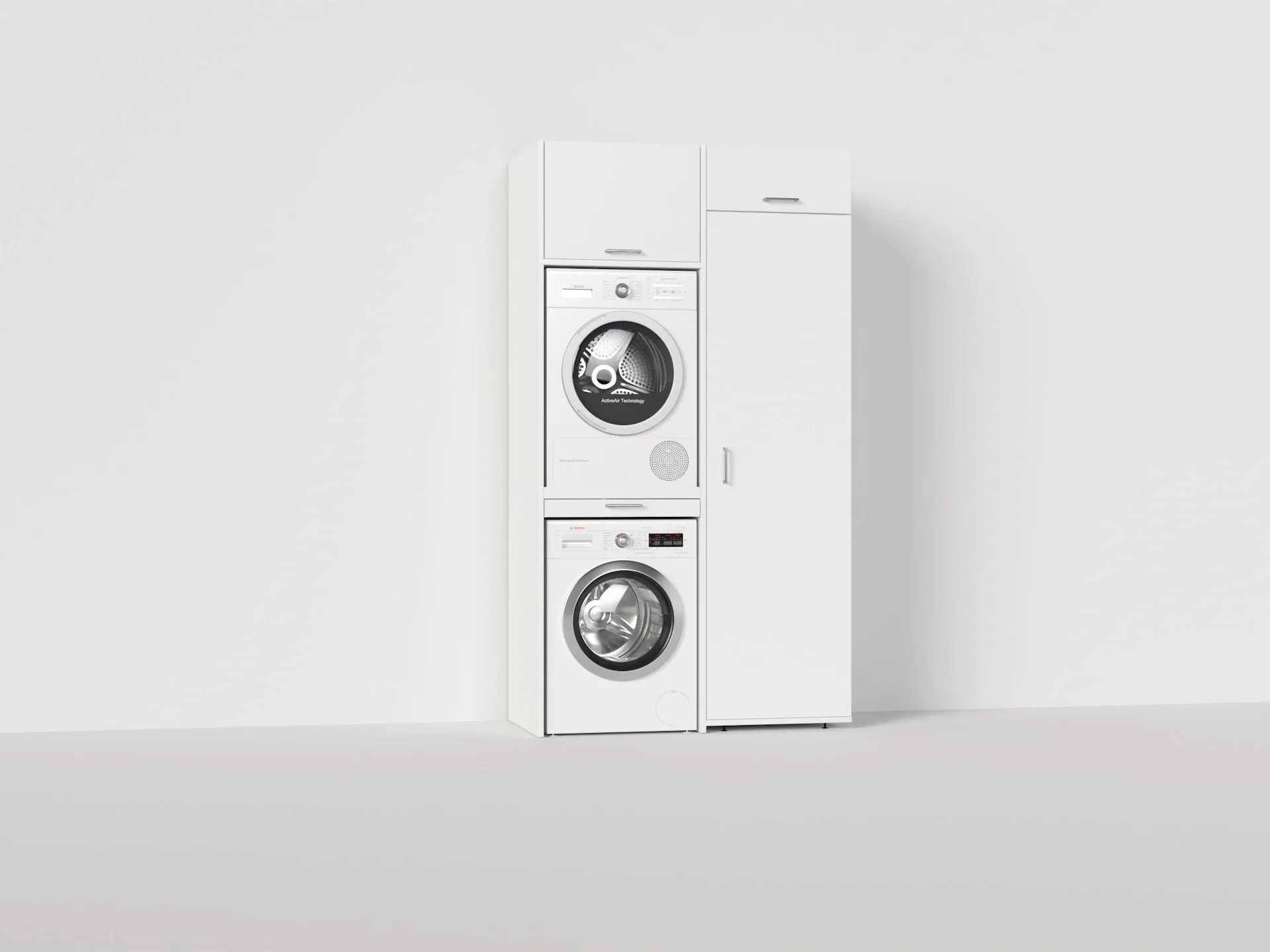 Met de Slimline serie van Wastoren® in een tijdloos witte look maakt u uw wasplaats niet alleen overzichtelijk en gebruiksvriendelijk, maar ook stijlvol. Met deze kast stapelt u 100% veilig uw droogkast en wasmachine boven op elkaar. Het plaatsen van een droogkast op een wasmachine is ideaal voor kleinere wasplaatsen waarbij u efficiënt moet omgaan met de beschikbare meters. De uitschuifbare plank/lade kan worden gebruikt voor het plaatsen van uw wasmand. Dit maakt het in- en uitladen van de was veel ergonomischer en makkelijker. De klepkast en hoge opbergkast kunnen worden gebruikt voor extra opbergruimte voor al uw wasbenodigdheden. Het leidingwerk kan netjes worden weggewerkt achter de kasten, wat bijdraagt aan de strakke en opgeruimde uitstraling. De kast is bovendien ook geschikt voor kleinere koelkasten en/of vriezers, wat flexibiliteit biedt in het gebruik van uw ruimte.